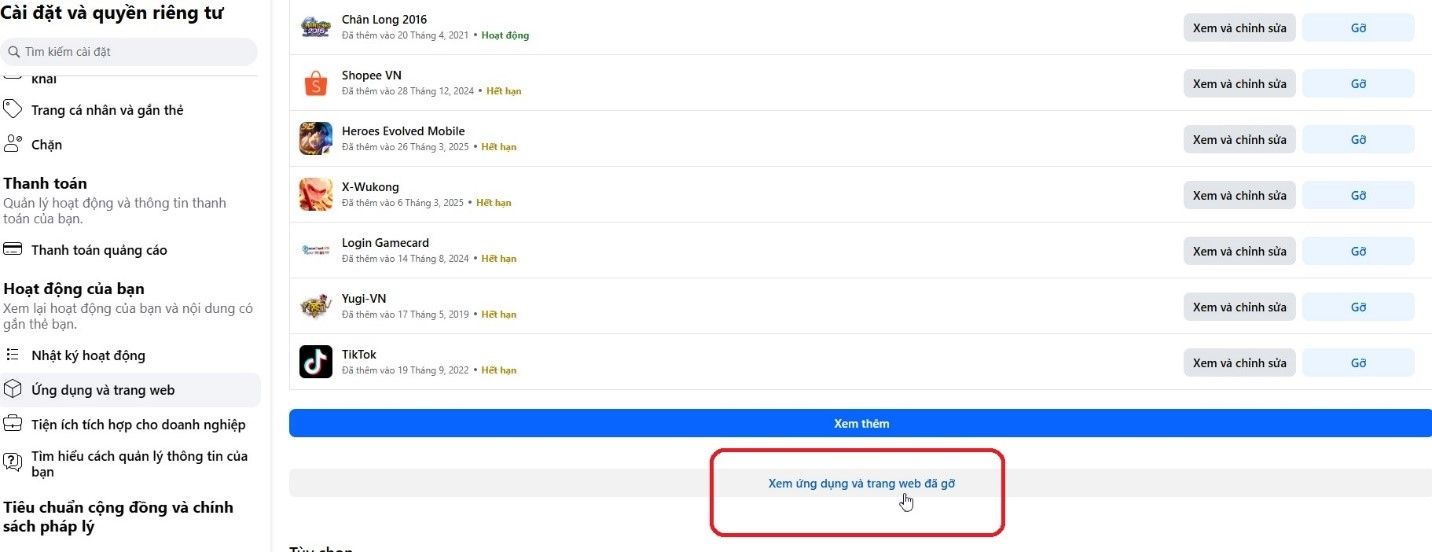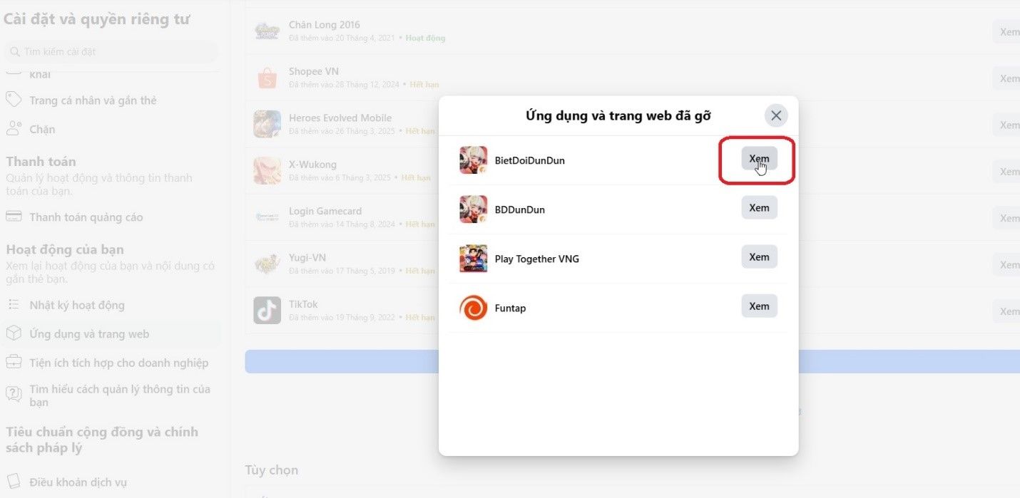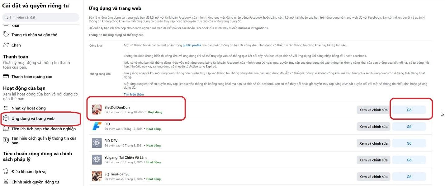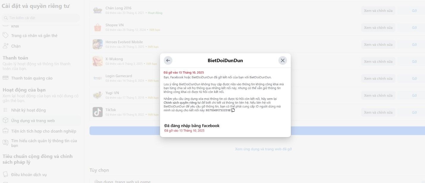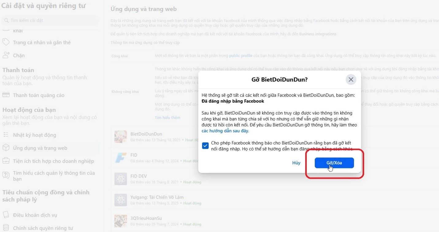 B3: Chọn Xóa, gỡ bỏ để gỡ bỏ mọi hoạt động của BietDoiDunDun với Facebook của bạn
