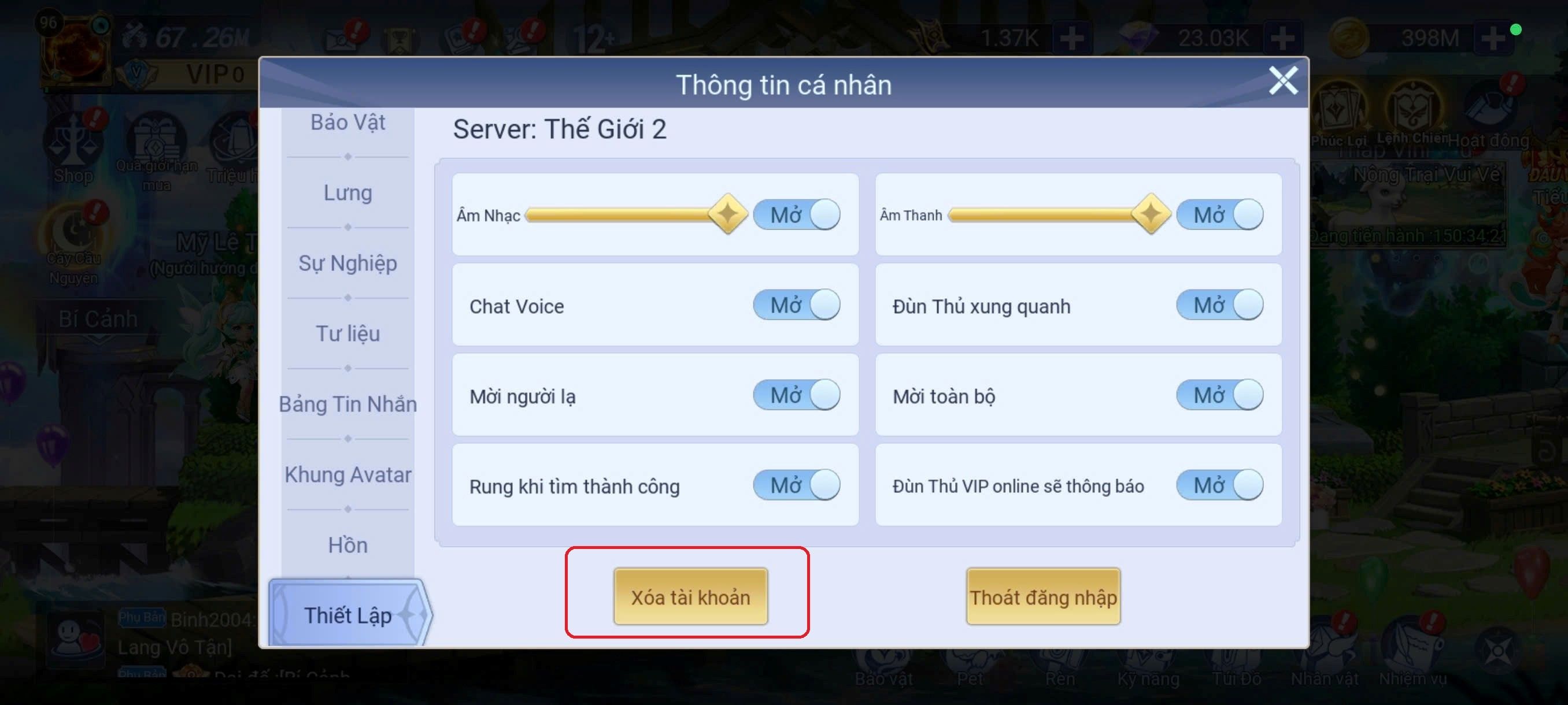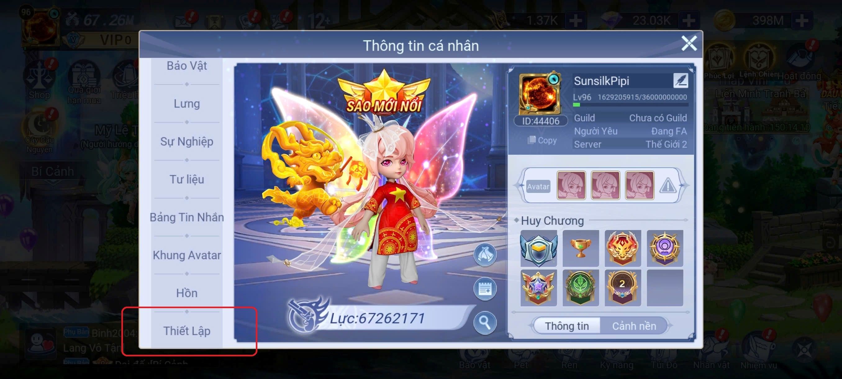 B1: Từ Trang Thông tin nhân vật chọn Thiết Lập