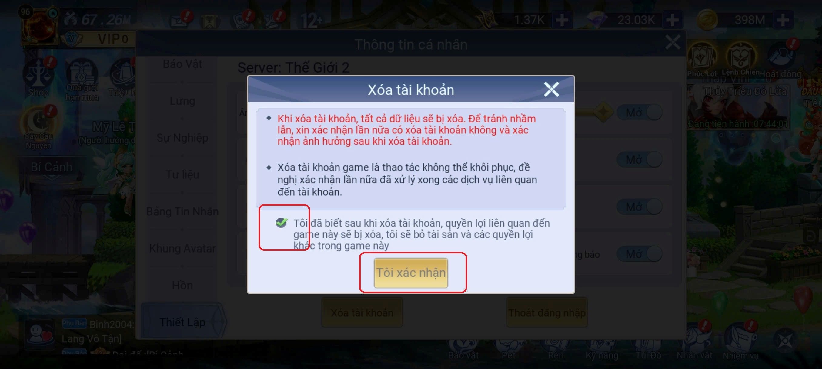 B3: Tích chọn và ấn xác nhận yêu cầu xóa tài khoản