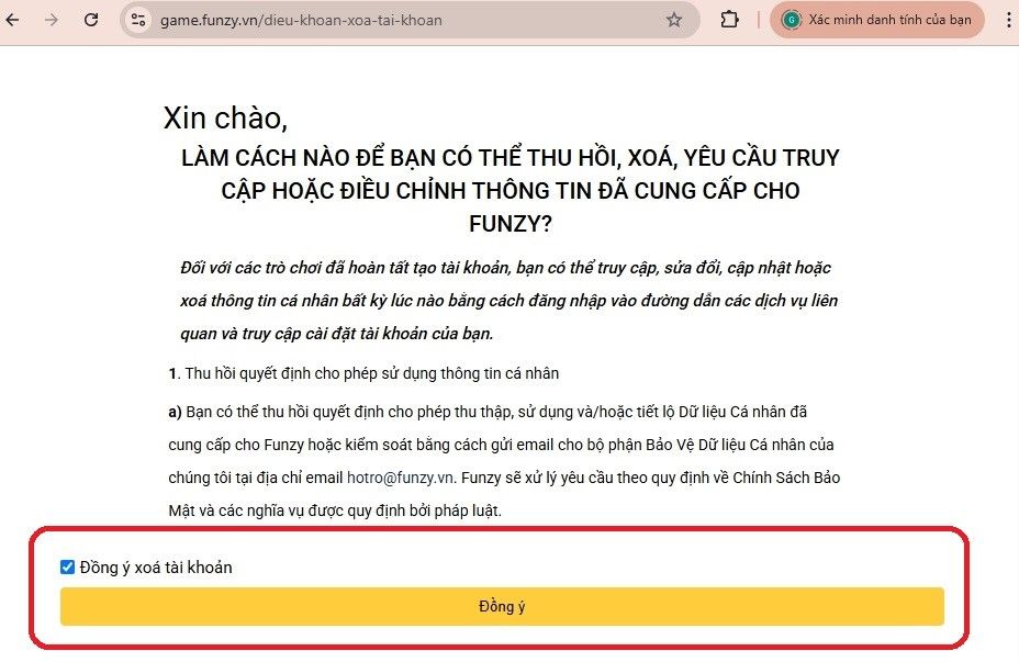 B4: Trang Điều khoản xóa tài khoản sẽ mở ra, người dùng đọc và xác nhận để thực hiện việc xóa tài khoản.
